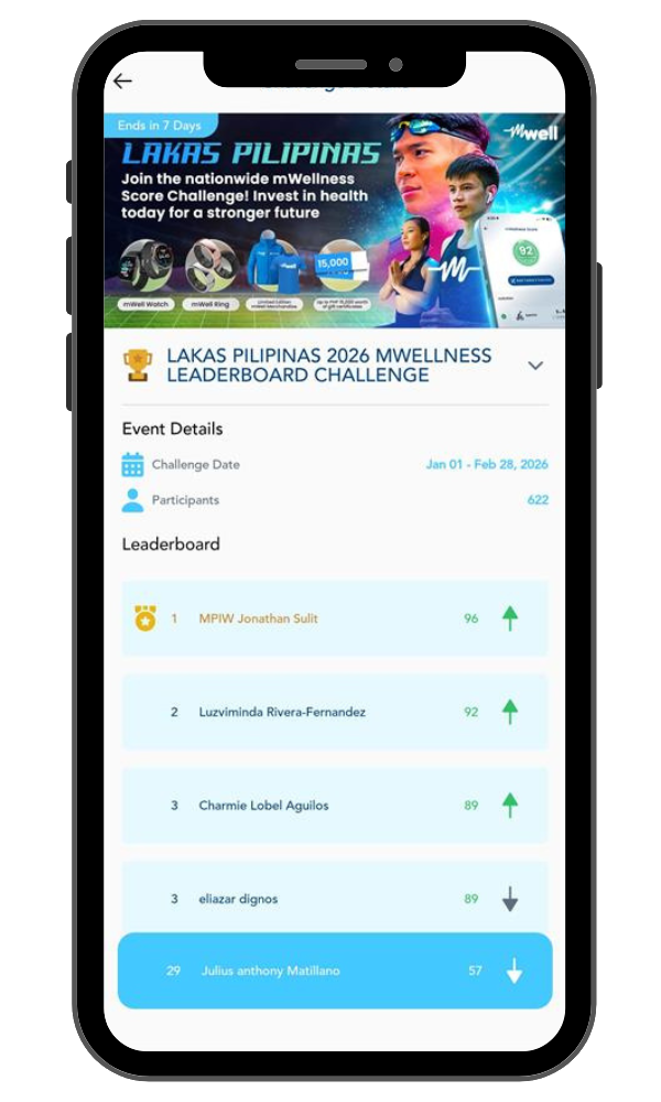 Tracks physical activity with over 100 sports modes, as well as blood pressure, heart rate, and blood oxygen. When paired with the mWellness Score in the mWell app, it helps track exercise, steps, sedentary behavior, and sleep